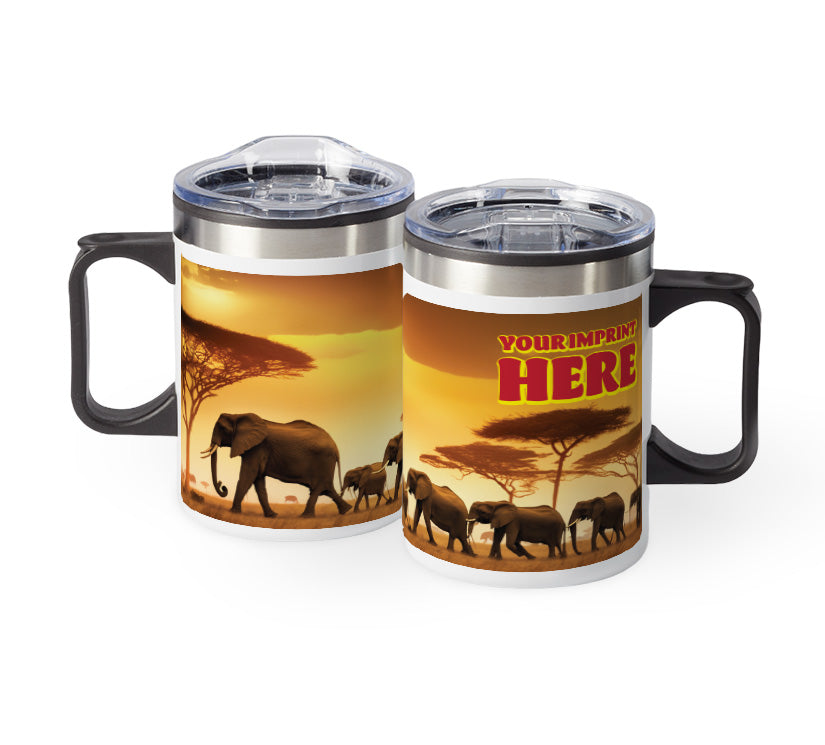 This 14 oz. Double-Wall Insulated Travel Mug comes with a lid to prevent spills. featuring a durable white stainless-steel exterior, a black plastic liner, and a sleek stainless-steel trim. the double-wall insulation keeps drinks hot or cold for up to 4 hours. Eco Friendly and BPA Free. Imprint Details: Full-color sublimation. Imprint Size: 8" x 3.6" Standard Production Time: 5 business days upon credit approval.MSRP : $16.49