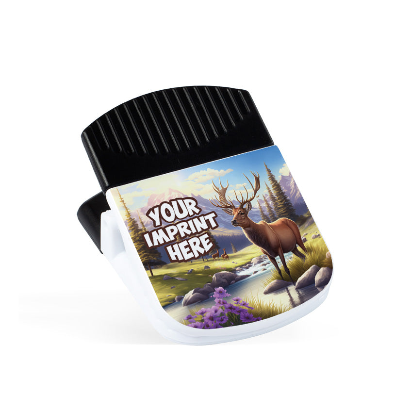 The magnetic clip is perfect as a chip or snack bags clip. It features a heavy-duty, spring-loaded hinge and a strong magnet on the back for added versatility. Imprinted, assembled, and packaged in the USA