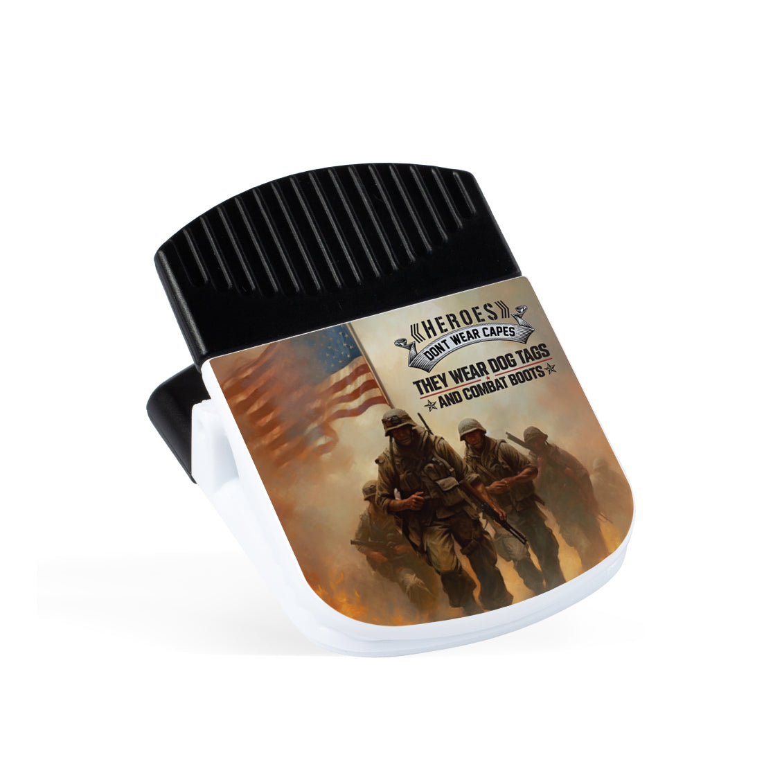 The magnetic clip is perfect as a chip or snack bags clip. It features a heavy-duty, spring-loaded hinge and a strong magnet on the back for added versatility. Imprinted, assembled, and packaged in the USA