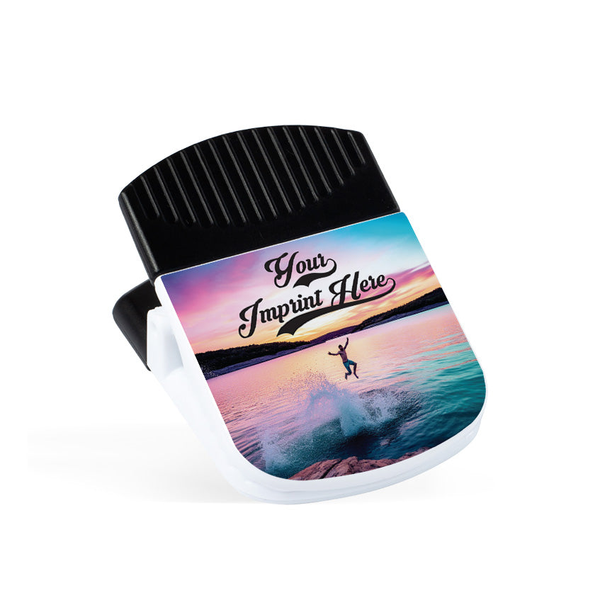 The magnetic clip is perfect as a chip or snack bags clip. It features a heavy-duty, spring-loaded hinge and a strong magnet on the back for added versatility. Imprinted, assembled, and packaged in the USA