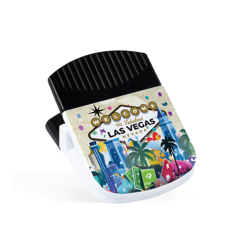 The magnetic clip is perfect as a chip or snack bags clip. It features a heavy-duty, spring-loaded hinge and a strong magnet on the back for added versatility. Imprinted, assembled, and packaged in the USA