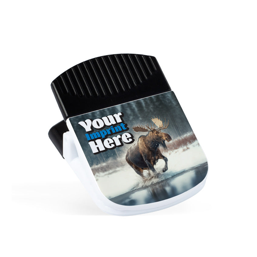 The magnetic clip is perfect as a chip or snack bags clip. It features a heavy-duty, spring-loaded hinge and a strong magnet on the back for added versatility. Imprinted, assembled, and packaged in the USA