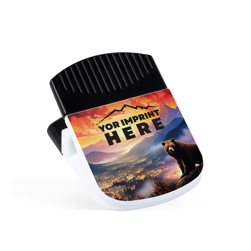 The magnetic clip is perfect as a chip or snack bags clip. It features a heavy-duty, spring-loaded hinge and a strong magnet on the back for added versatility. Imprinted, assembled, and packaged in the USA