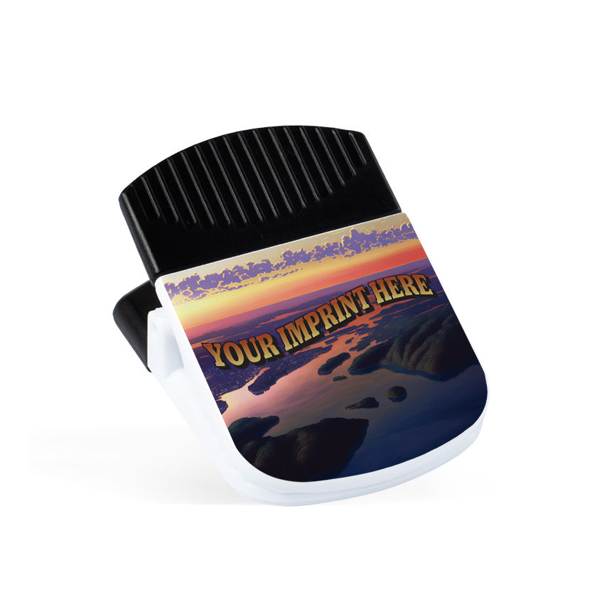 The magnetic clip is perfect as a chip or snack bags clip. It features a heavy-duty, spring-loaded hinge and a strong magnet on the back for added versatility. Imprinted, assembled, and packaged in the USA Product Size: 2L x 1.4W x 2.9H Standard Production Time: 5 business days upon credit approval. MSRP :  $4.89