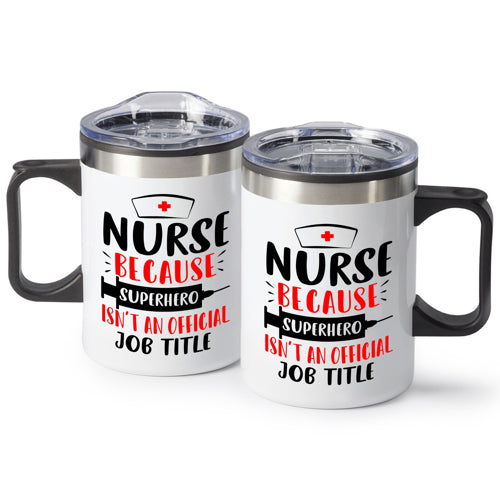 This 14 oz. Double-Wall Insulated Travel Mug comes with a lid to prevent spills. featuring a durable white stainless-steel exterior, a black plastic liner, and a sleek stainless-steel trim. the double-wall insulation keeps drinks hot or cold for up to 4 hours. Eco Friendly and BPA Free.