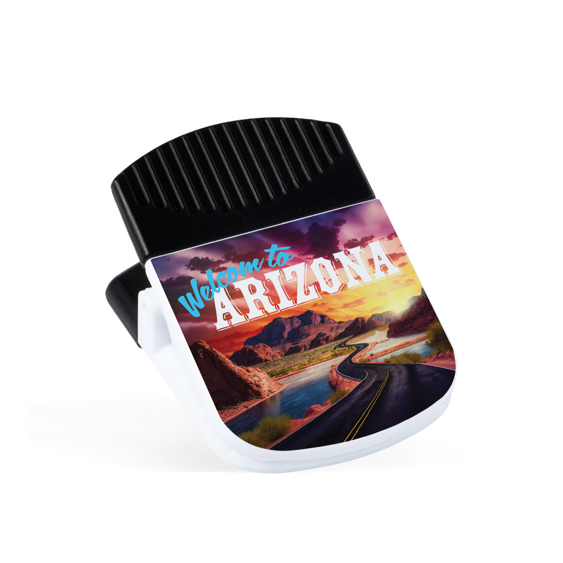 The magnetic clip is perfect as a chip or snack bags clip. It features a heavy-duty, spring-loaded hinge and a strong magnet on the back for added versatility. Imprinted, assembled, and packaged in the USA